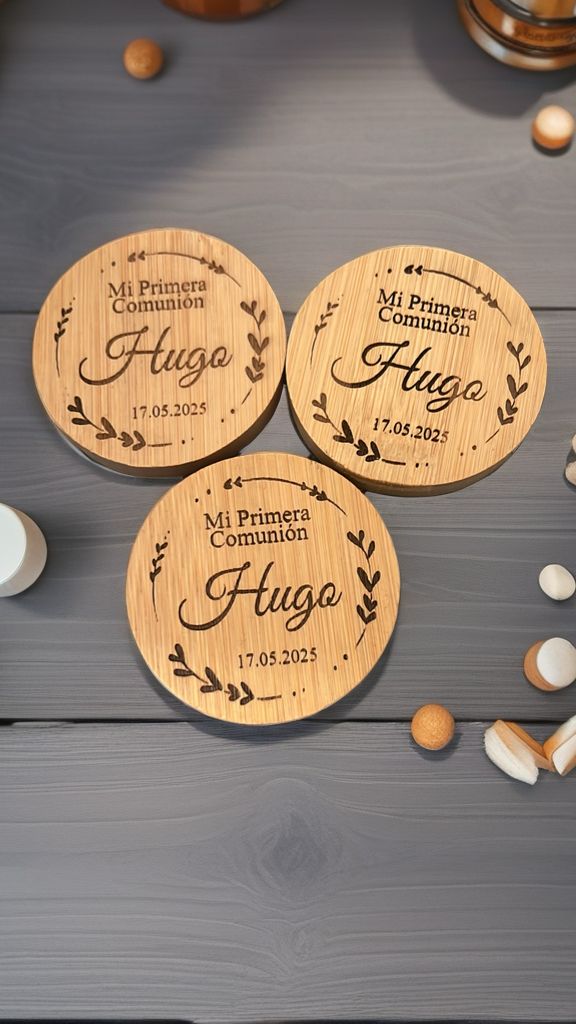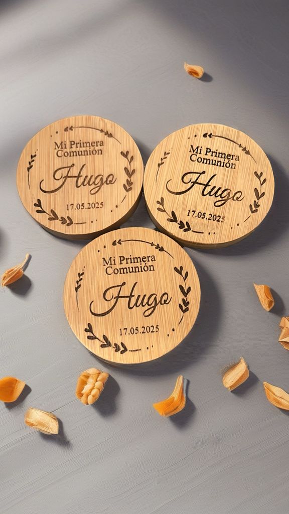 Cada pieza cuenta con un grabado a láser de alta precisión que resalta sobre el tono cálido del bambú, aportando un toque natural y sofisticado.