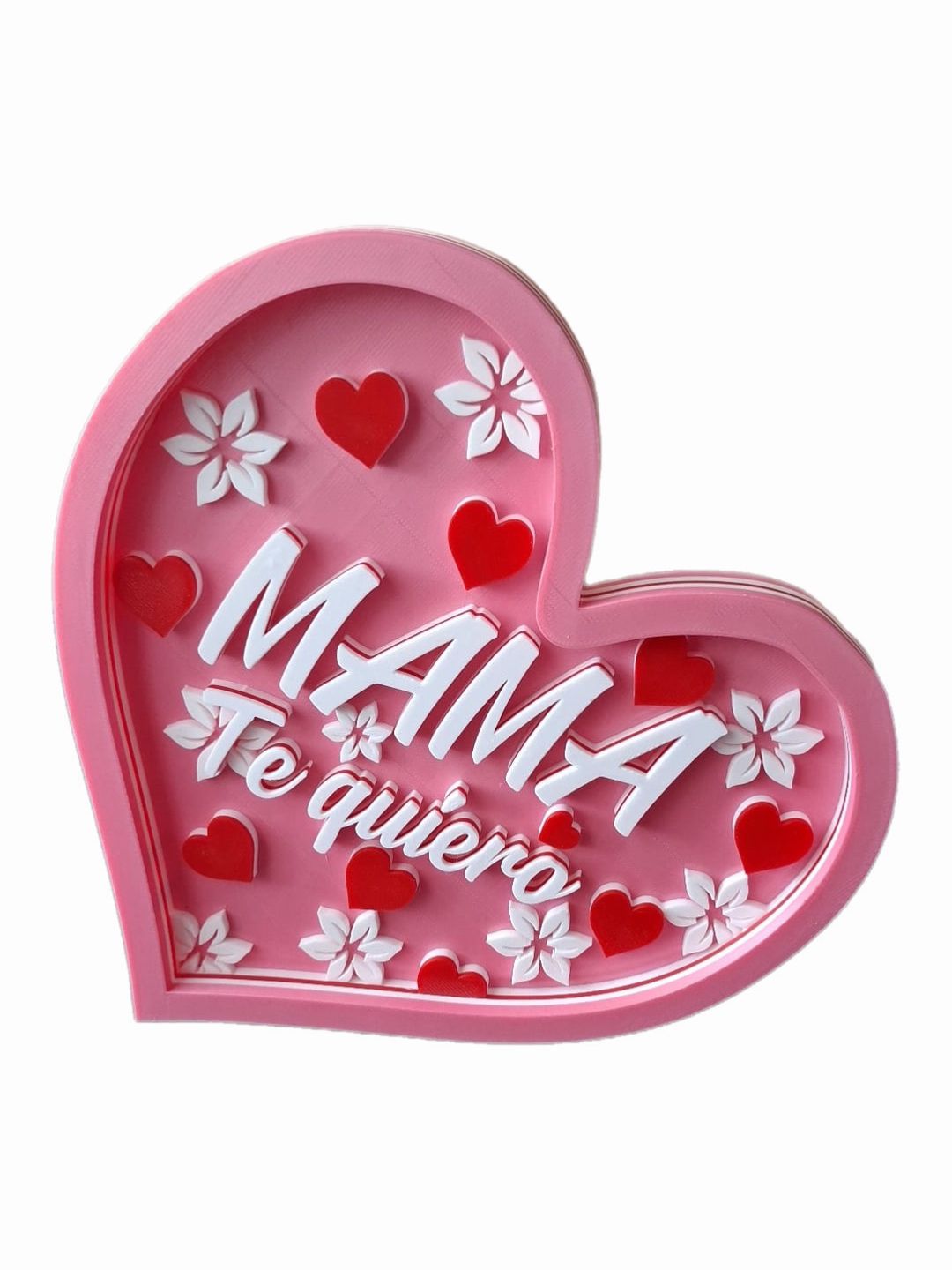 Demuestra tu amor con este hermoso corazón decorativo con la frase “Mamá, te quiero”. Elaborado en tonos rosados y decorado con flores blancas y corazones rojos, es el detalle perfecto para expresar cariño y gratitud. Ideal para regalar en el Día de la Madre, cumpleaños o cualquier ocasión especial.