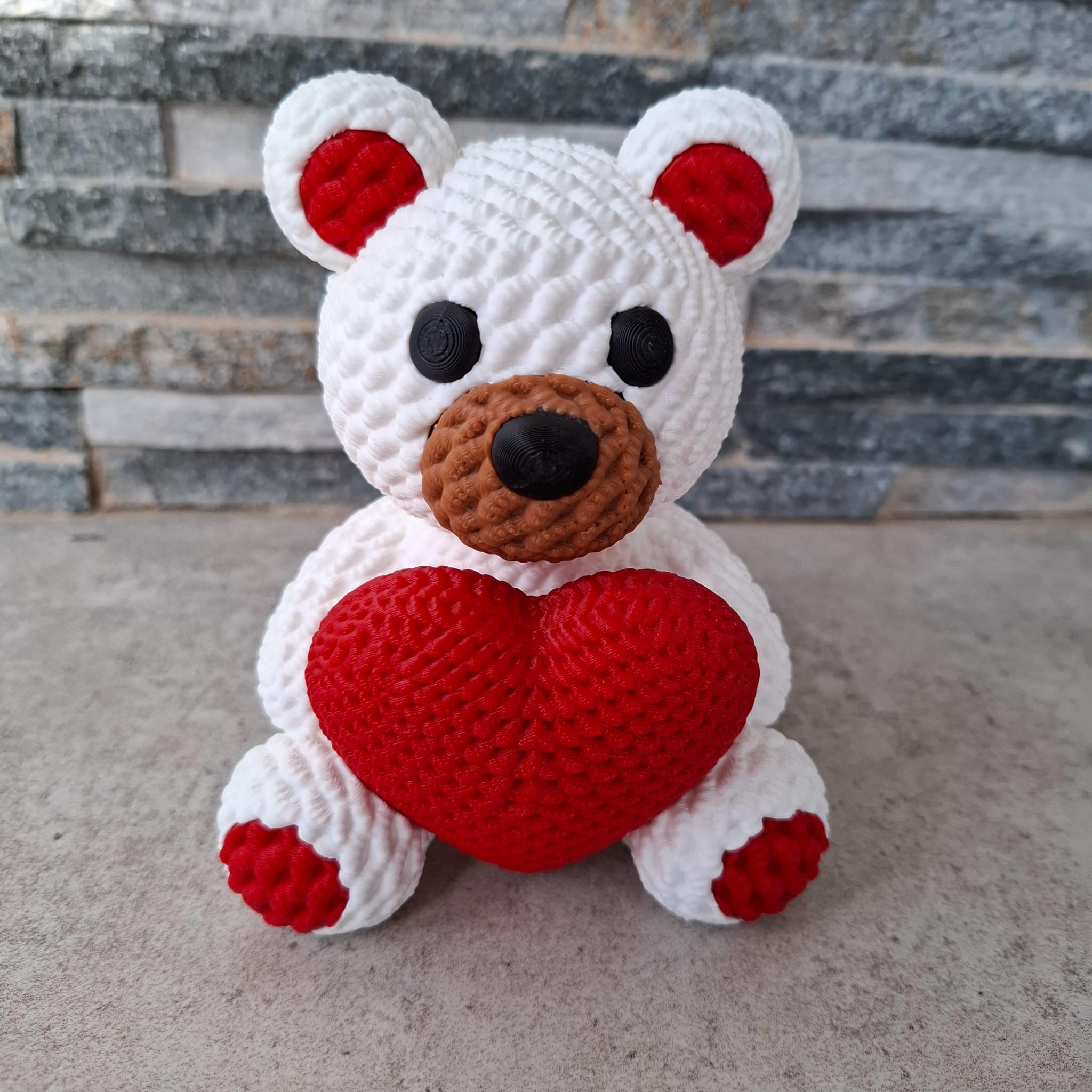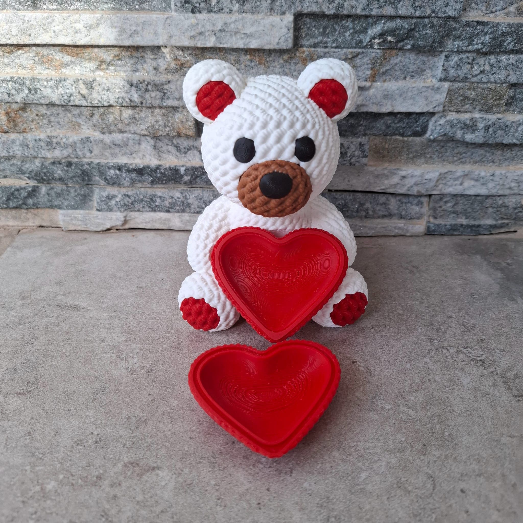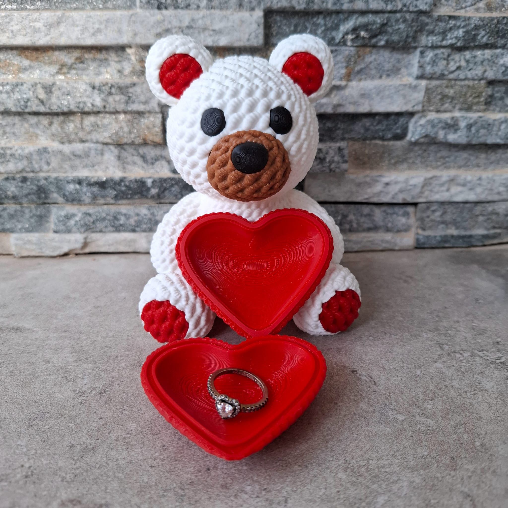 Este adorable osito impreso en 3D es el regalo perfecto para sorprender con ternura y originalidad. Diseñado con texturas que imitan el croché, combina la apariencia artesanal con la innovación de la impresión 3D. Disponible en colores blanco, negro y marrón, sostiene un corazón rojo que oculta un pequeño compartimento secreto, ideal para guardar notas, anillos u otros detalles especiales.